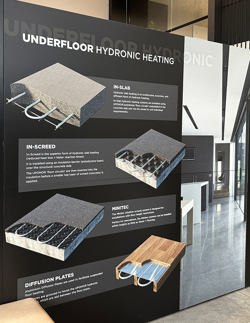 See how hydronic pipes embedded in a concrete slab create gentle, even warmth that rises naturally from the floor for exceptional comfort. This live display shows how in‑slab underfloor heating works with modern controls and heat sources, helping you understand response times, ideal applications, and the benefits for open‑plan living and polished concrete floors.